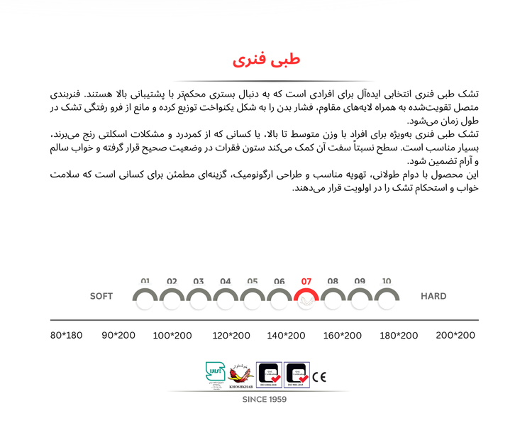 تشک طبی فنری انتخابی ایدهآل برای افرادی است که به دنبال بستری محکمتر با پشتیبانی بالا هستند. فنربندی متصل تقویتشده به همراه لایههای مقاوم، فشار بدن را به شکل یکنواخت توزیع کرده و مانع از فرو رفتگی تشک در طول زمان میشود.